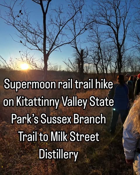 A friend and I recently went on a full-moon hike to a distillery. Organized by Kittatinny Valley State Park and led by one of its naturalists, our group set off at 4:30 p.m. beneath a bright sky and walked along the park’s Sussex Branch rail trail to Milk Street Distillery where we enjoyed a cocktail and BYO food before heading back in the dark beneath a full beaver supermoon. Not only were there more women than men on that outing, I met a woman who came alone. Over cocktails with names such as Let’s Get Saucy, The Autumn Reaper, and Poison Apple, she said she had some time to kill before meeting up with friends later, and decided to attend the outing. Funny enough, my friend was initially unsure she would be able to make the outing, and so I too would’ve gone solo. Check out the hike on my Instagram, The Great Local Outdoors: