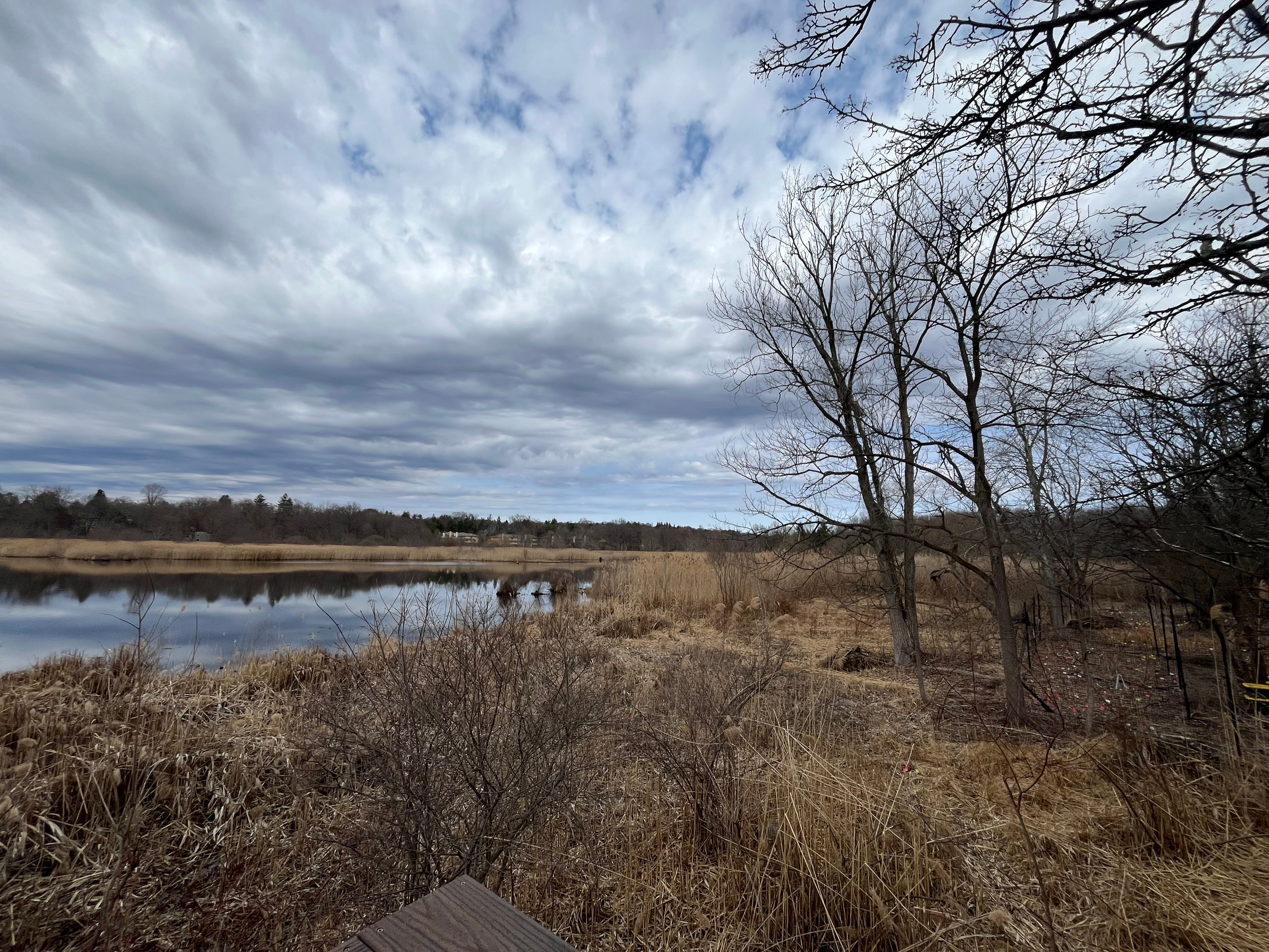 I volunteer as programs chair for the Celery Farm Nature Preserve, a 107-acre preserve in northern NJ. It’s very brown in early spring as you can see from the view from one of the raised platforms. Lake Appert’s to the left, and to the right with the teeny-tiny flags, our new native plant garden protected by deer fencing.