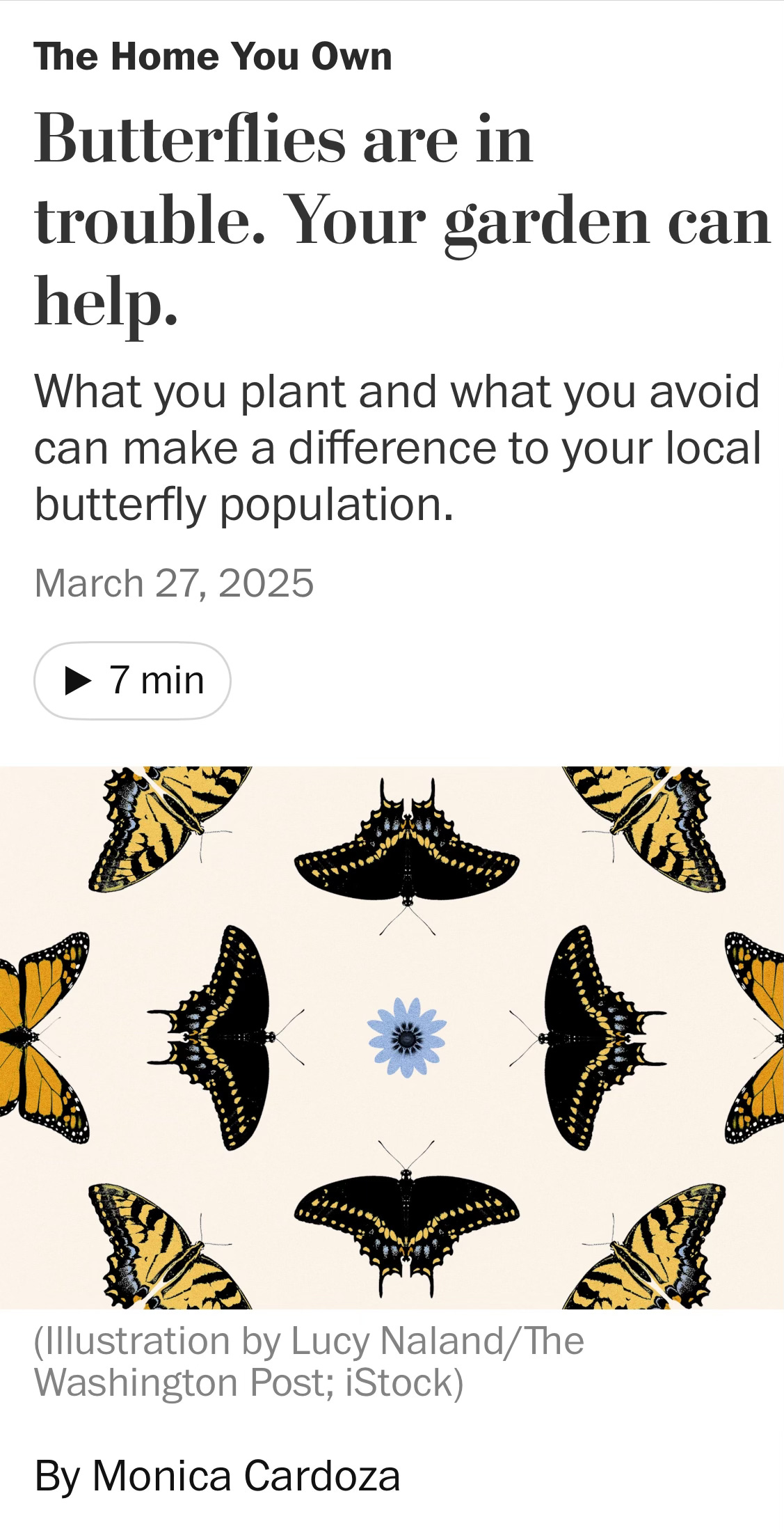 The result is Butterflies Are in Trouble. Your Garden Can Help. (Fingers crossed it’s not behind a paywall. The paywall often disappears a couple weeks after home and garden articles have run, so if this link fails to open the article, I apologize. But maybe try again later.)