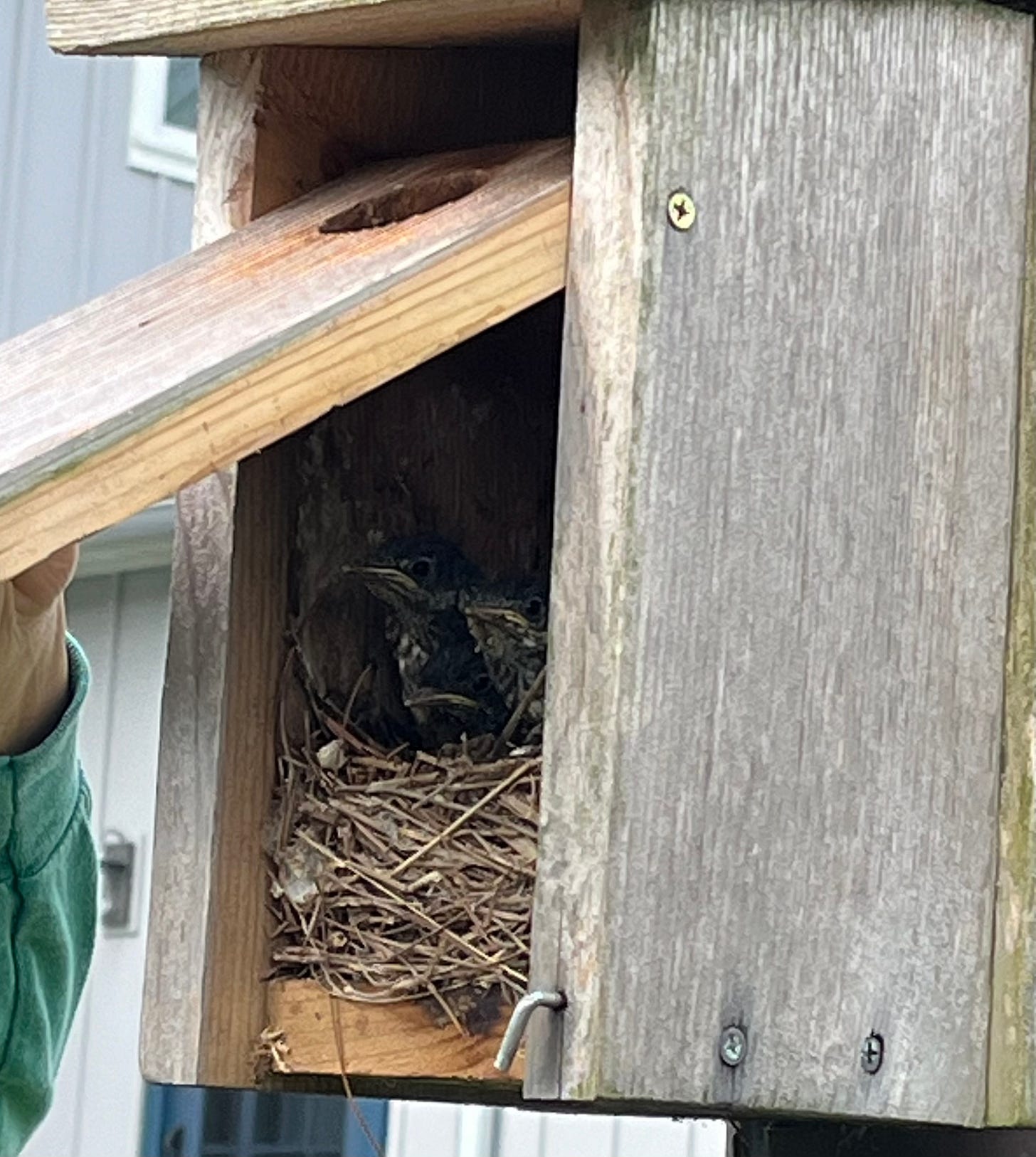 Eight members showed up on a stunning spring morning. After introductions, we set out, strolling past a pond with a couple of striking-green frogs, and a nest box that the owner opened to reveal young bluebirds inside (see below). We walked along a meadow and through forest, then past a stream with native brown trout that was being restored thanks to a federal grant. We saw a red-eyed vireo; a blue-gray gnatcatcher mobbing a male cowbird; an eastern bluebird feeding its young; four Baltimore orioles; a rose-breasted grosbeak; and a pair of yellow-throated vireos building a nest.