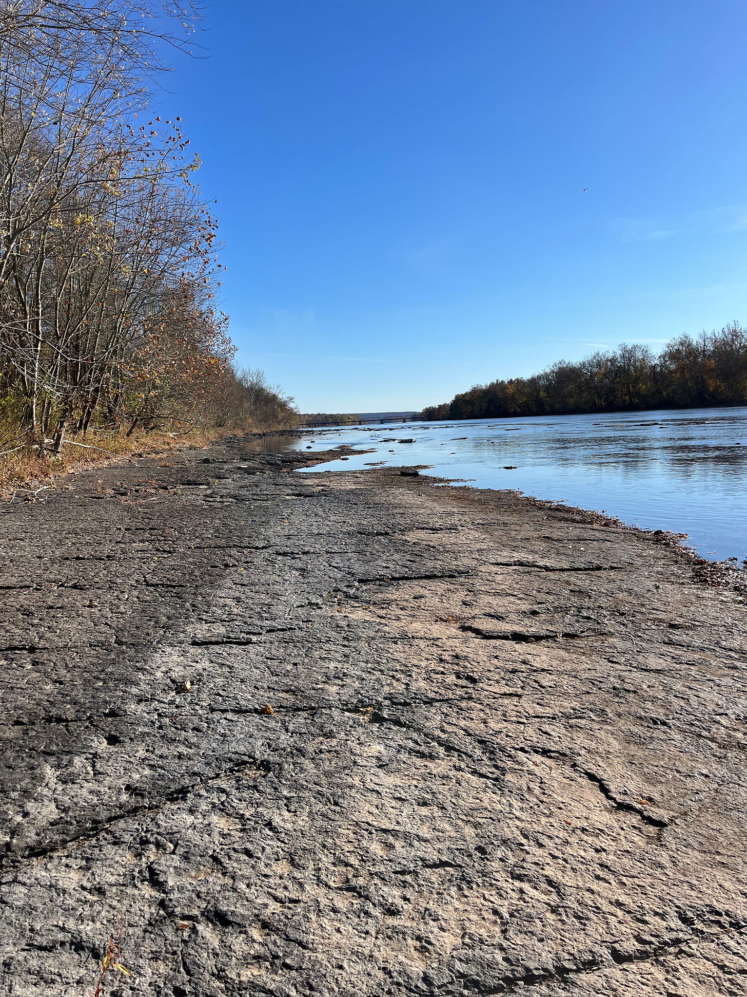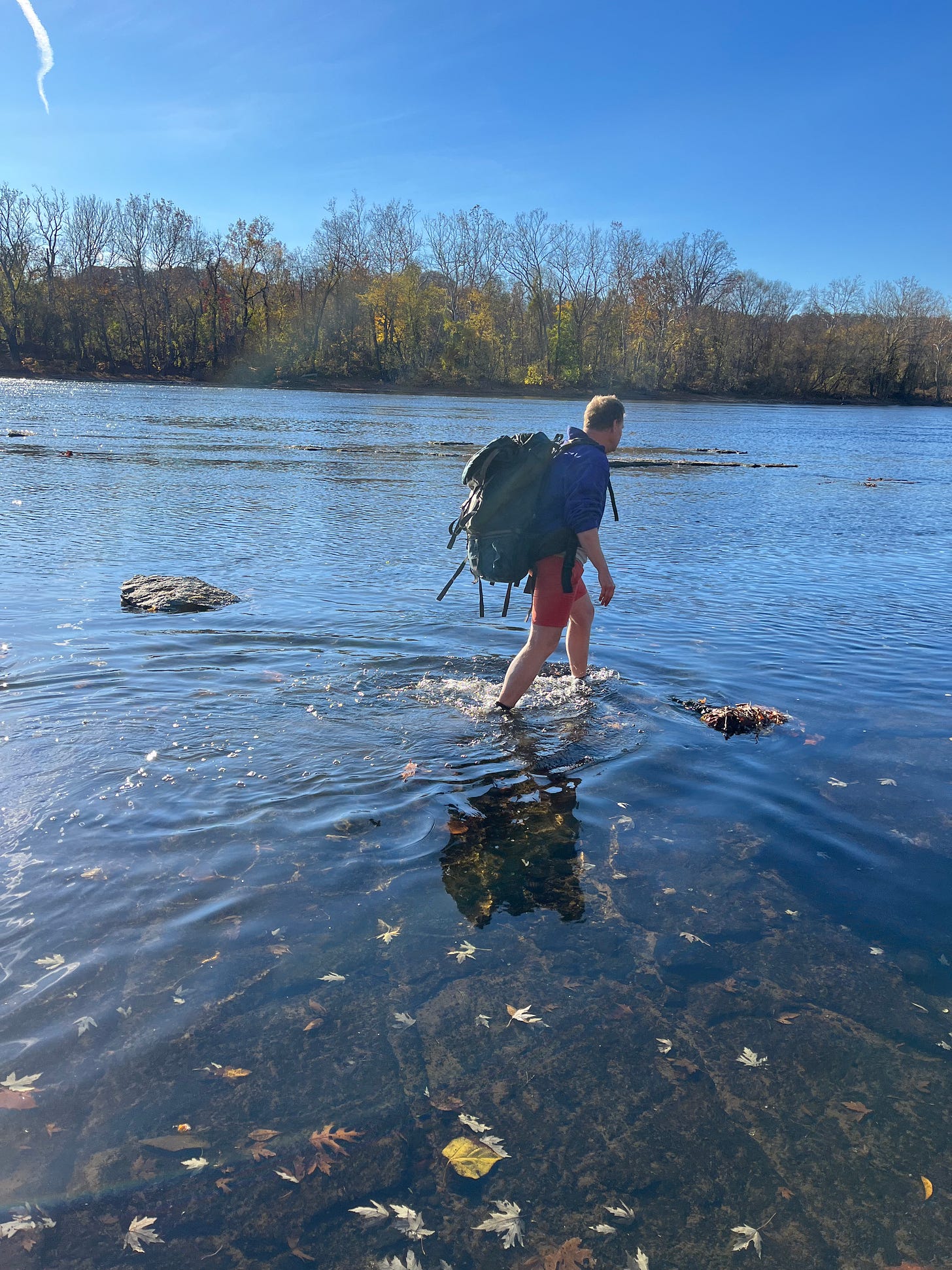 I followed Erik in my car a few miles north of Bulls Island Recreation Area, then pulled down a dead-end street by a ball field and parked in a small gravel lot. Erik donned a giant backpack containing a wetsuit in case he found a large patch of Podostemum further out in the river and wanted to explore it. We walked to the trail along the river until he found an opening with a path leading down to the river. Clutching branches and trying to avoid poison ivy, we descended to the river’s bedrock.