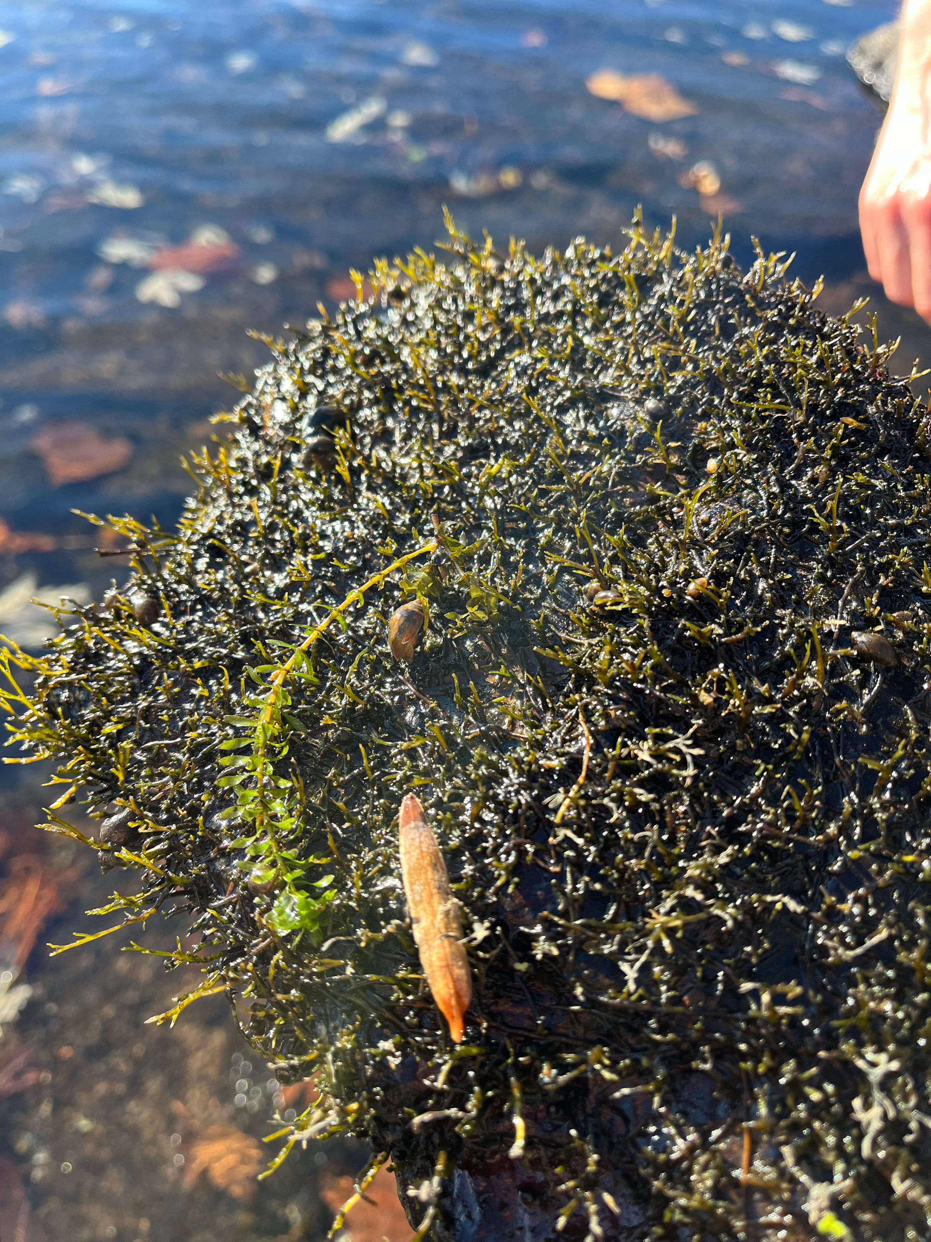 It took just a few minutes before Erik found a patch of Podostemum close enough to the water’s edge that I could touch it. I plunged my hand into the river and ran it along the plant. It felt like a bristly plastic scouring pad. Unlike moss or algae, it’s not slippery.